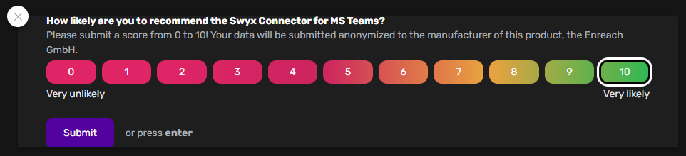 Enreach has integrated the Product Net Promotor Score (PNPS) survey into the Swyx Connector for Microsoft Teams App. The PNPS is now available in Swyx Connector for MS Teams from version 3 and newer and therefore available to all customers using SwyxWare 13.20 or newer.